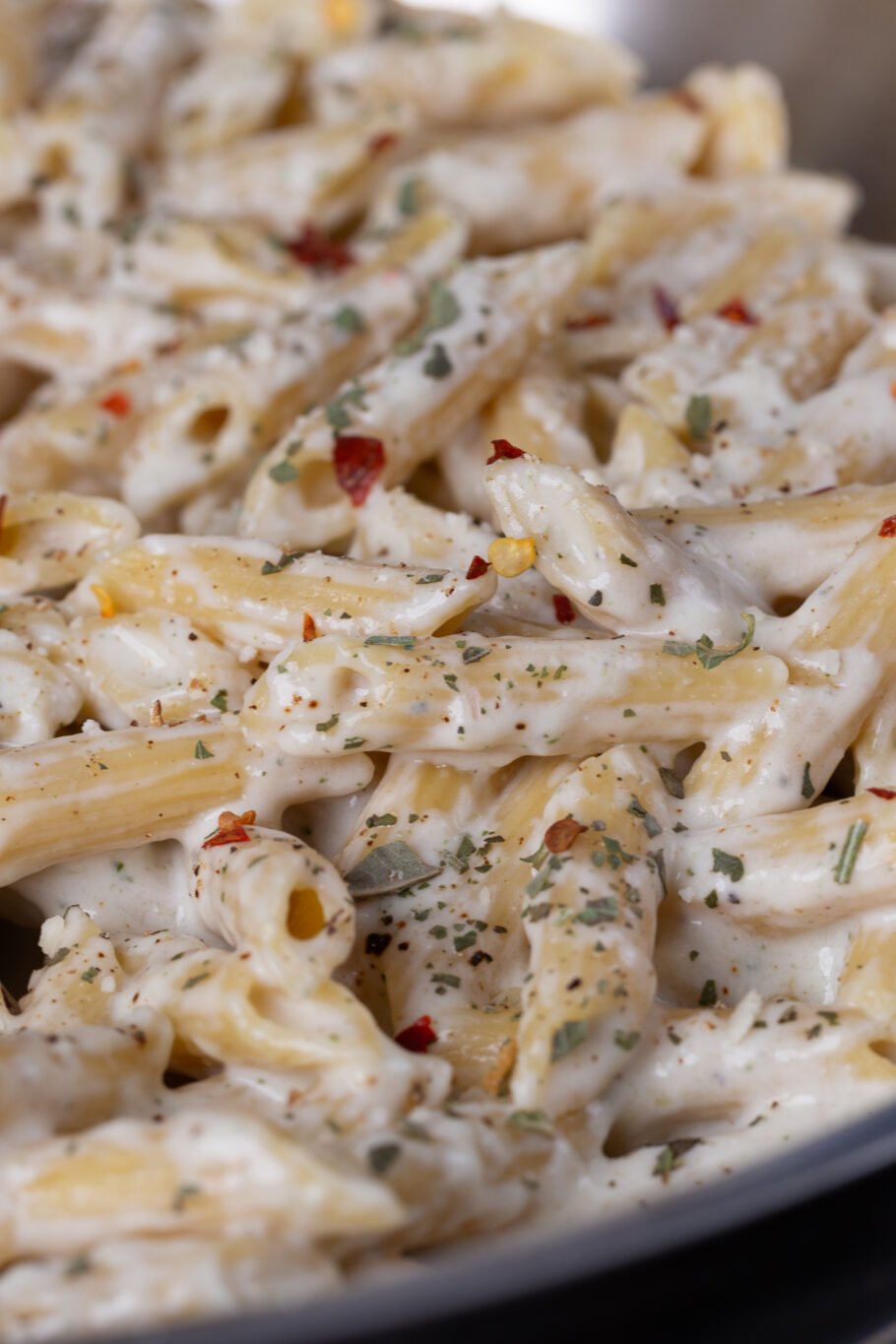 Once that’s done cooking and drained, add it right into your cottage cheese Alfredo sauce. Mix everything around for a couple minutes until your pasta is fully coated.
