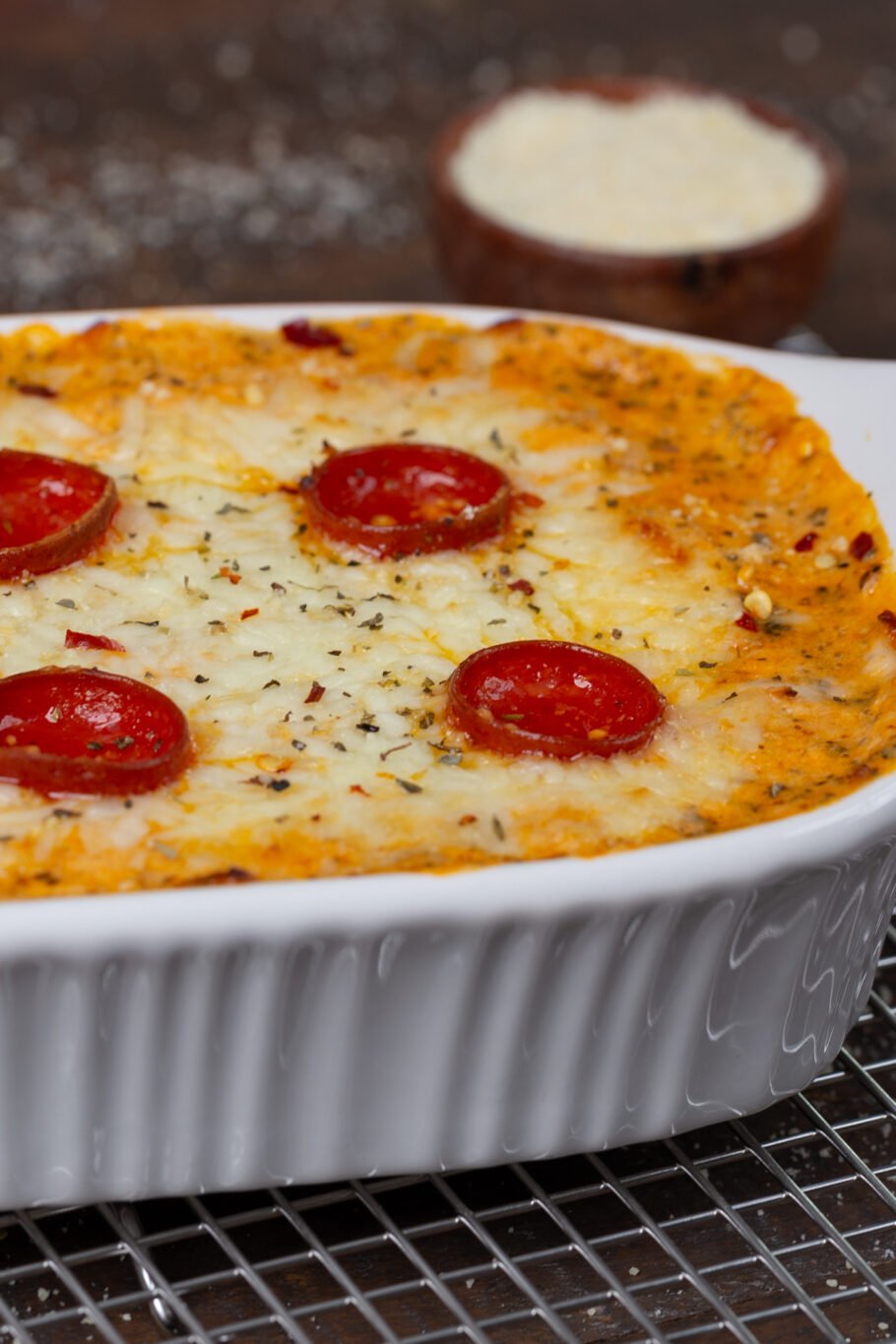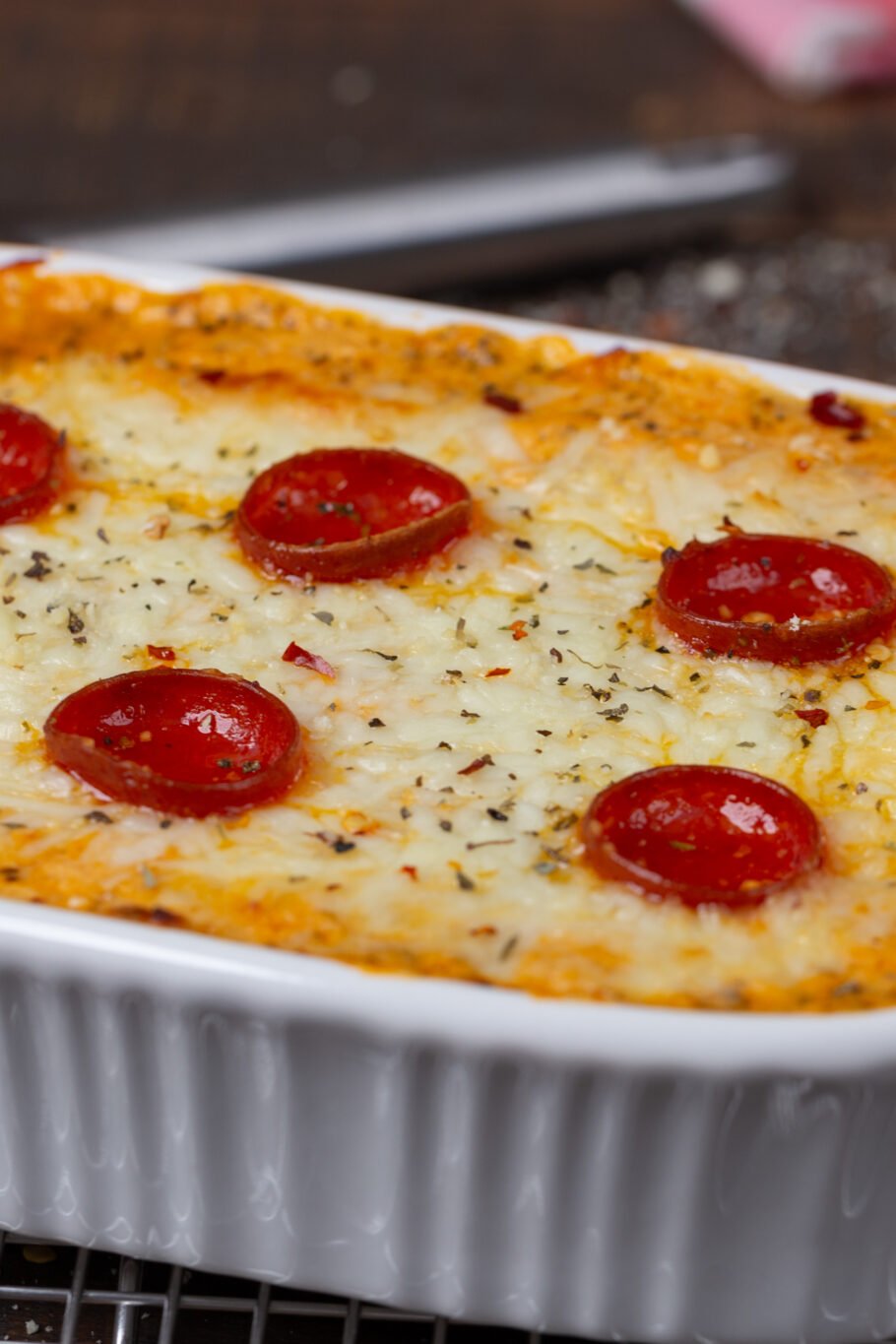 Last, top it with 1/4 cup of some more mozzarella or your favorite pizza cheese and some optional pepperoni slices. I like to cut mine up so that it’s easier to get some pepperoni in every bite.