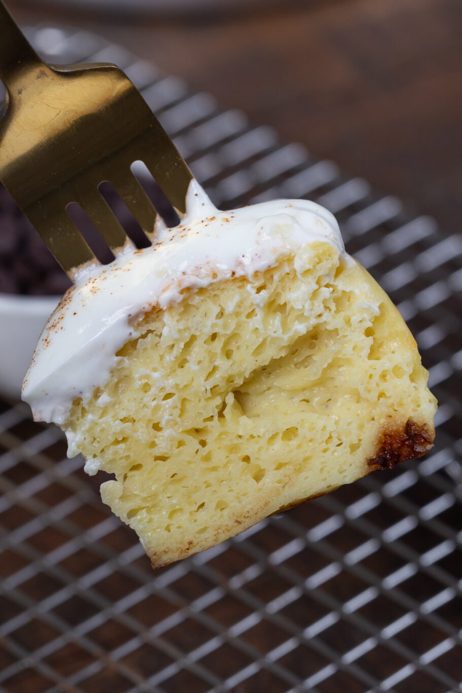 Pretty good for a cake made with Greek yogurt and protein powder. I added probably 1-2 tbsp of sugar on top of the 2 listed in the recipe to make sure it was sweet enough. It is “eggy” in taste, but I still like it. The texture is fine – not really rubbery at all.