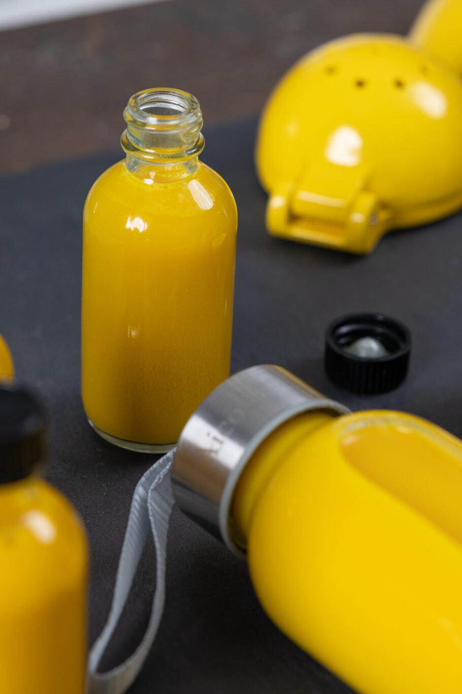 - Evenly distribute the juice into a large bottle or small shot glasses bottles