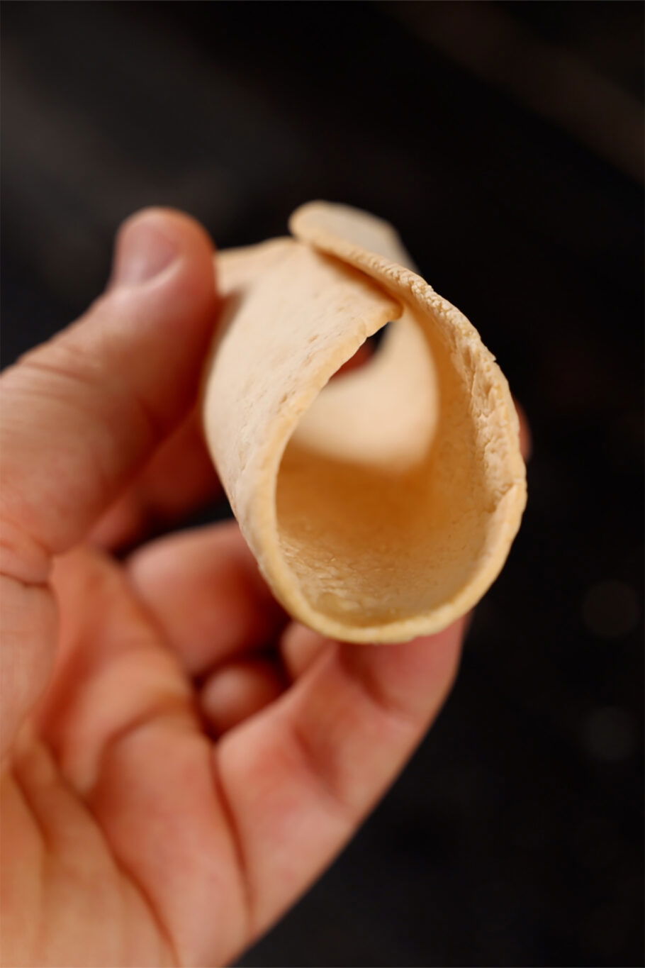 Wrap your tortilla around whatever you’re using and hit it with a toothpick to close it. If your tortillas are flexible enough you alternatively put them seam side down.