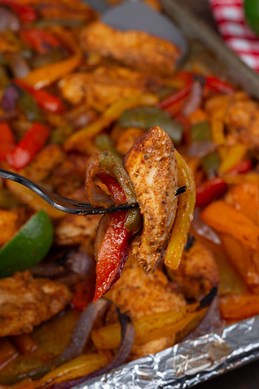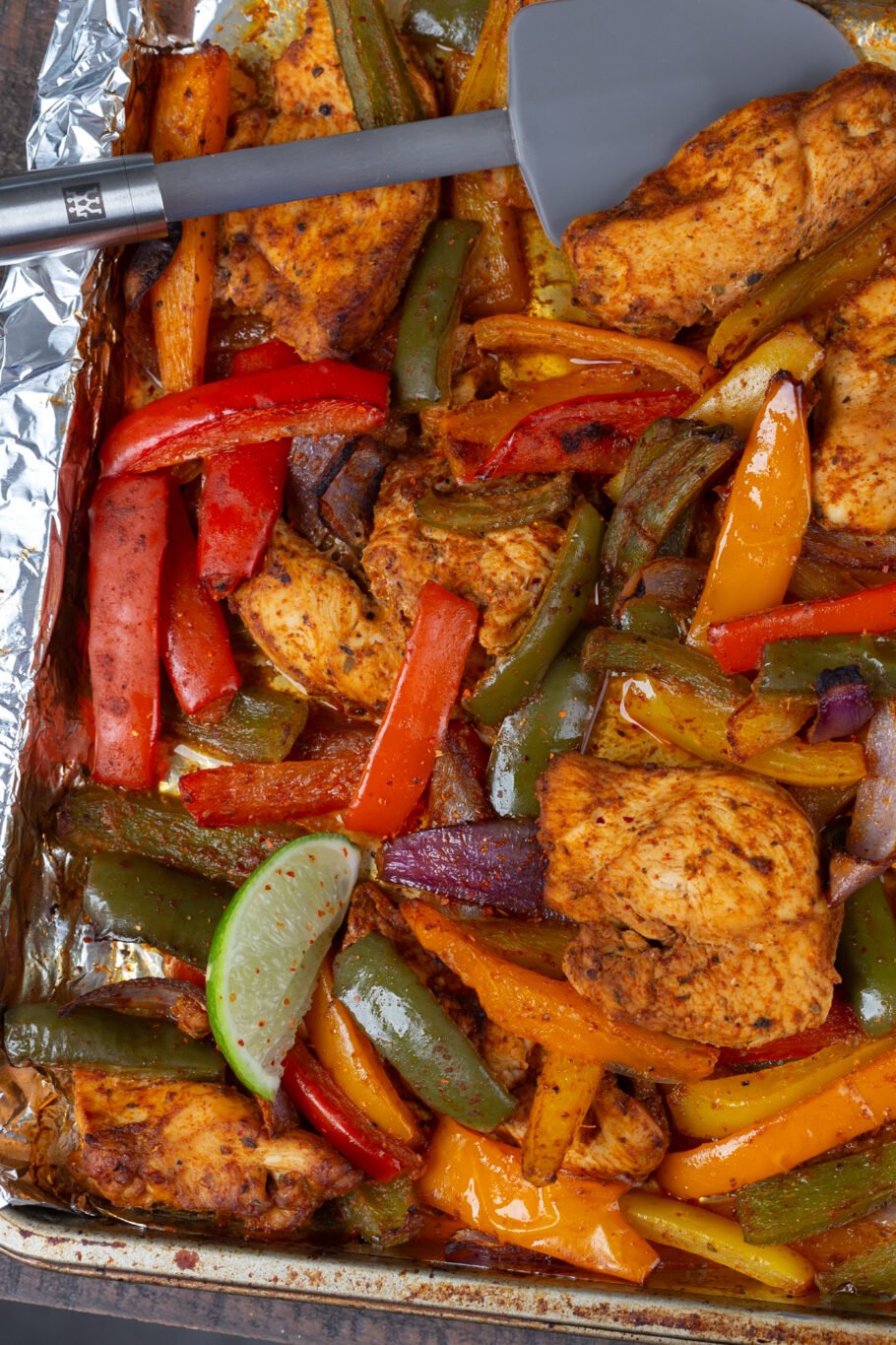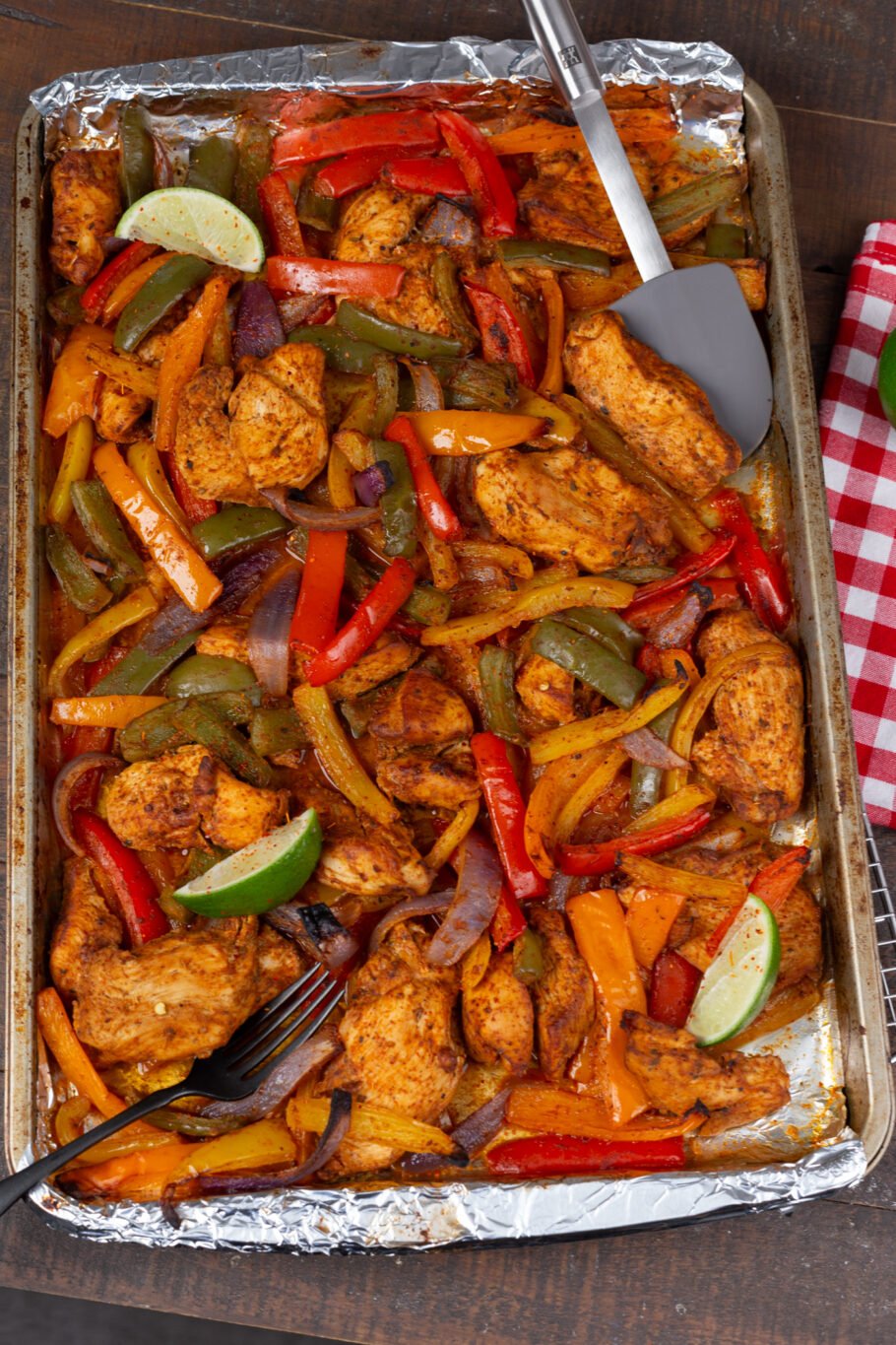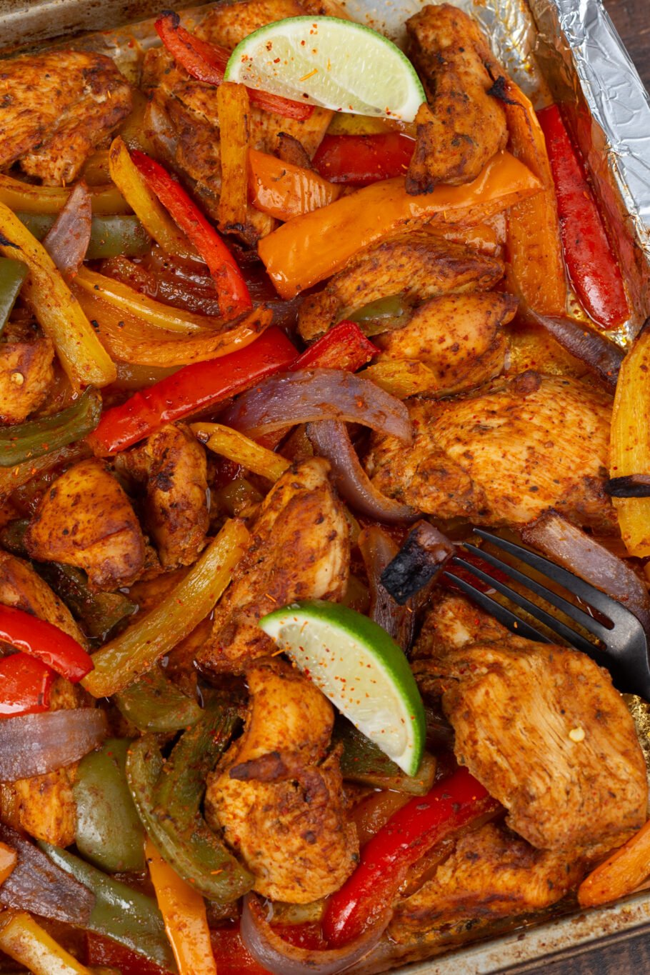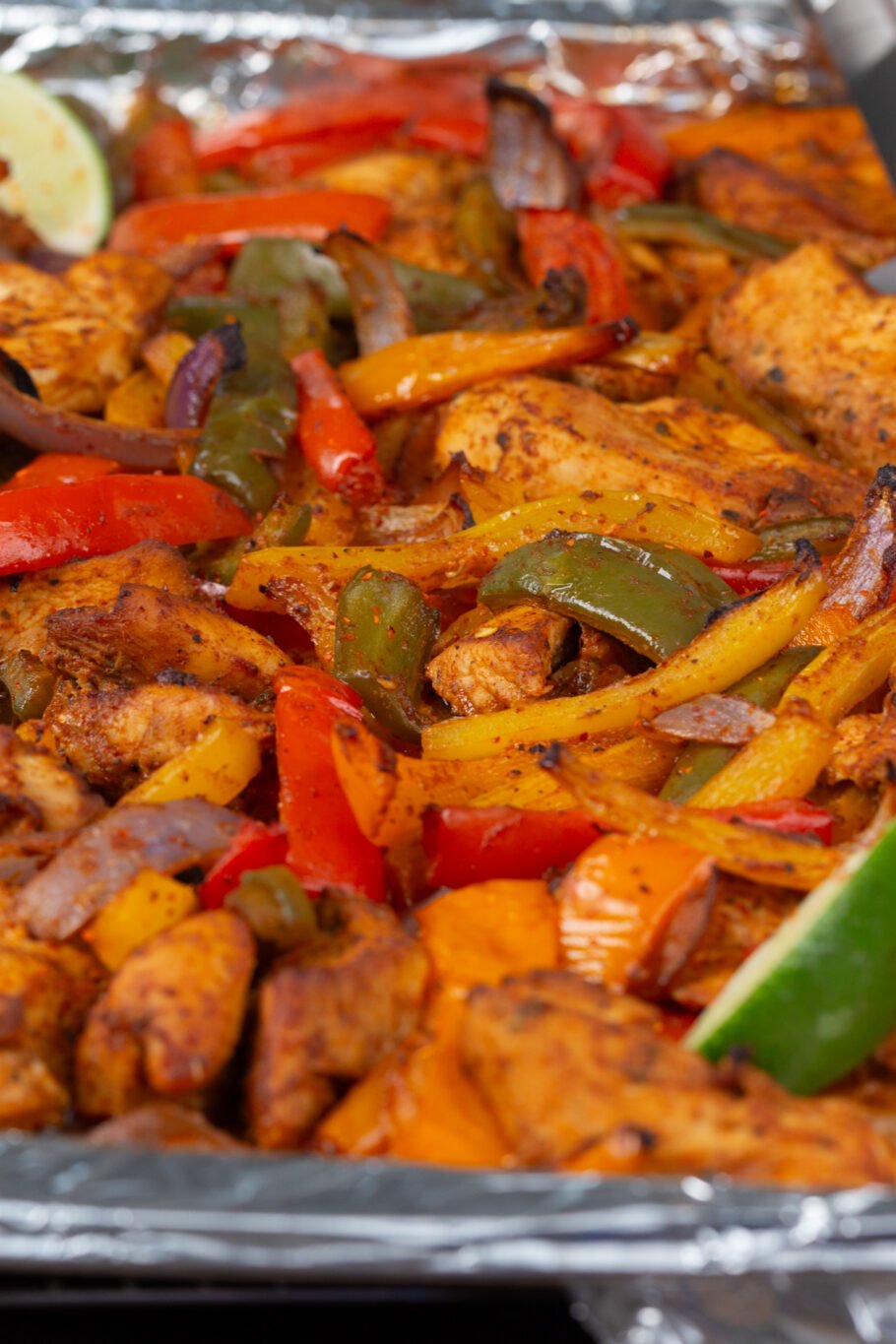 Coat your pan with a little cooking spray or olive oil and pour your chicken fajita mix onto it. Do your best to evenly distribute it across your pan then throw it in the oven on 400F/204C for around 40 minutes.