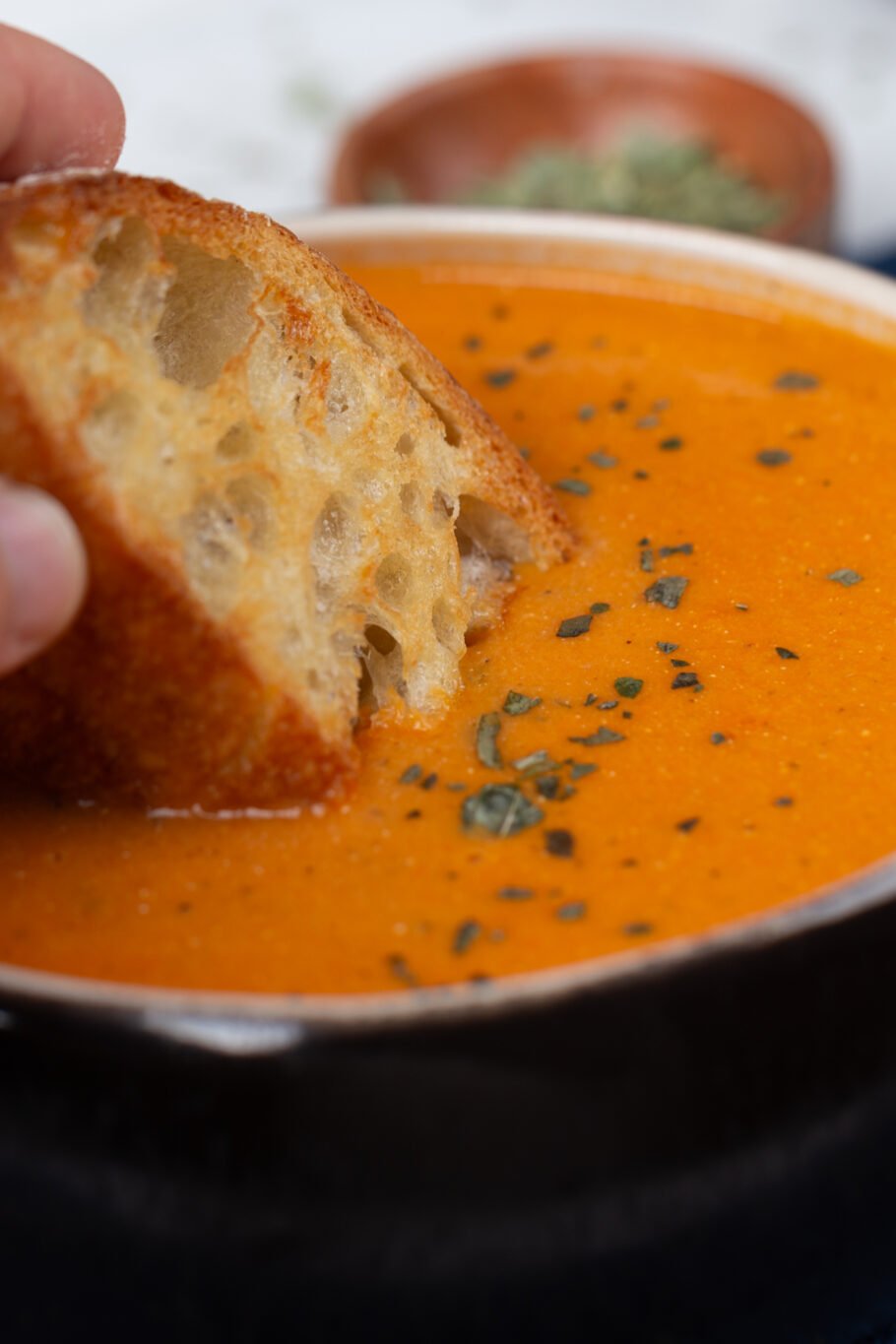We’re back again and we’re back with our good friend cottage cheese. We’ve put it in our eggs, cheesecake, mac and cheese, and even protein bars with success! Today? We get even more adventurous and throw it into an absolutely delicious and creamy Healthy Tomato Soup with Protein. This recipe is super calorie friendly, great for volume eating, easy to make, and packed with awesome macros.