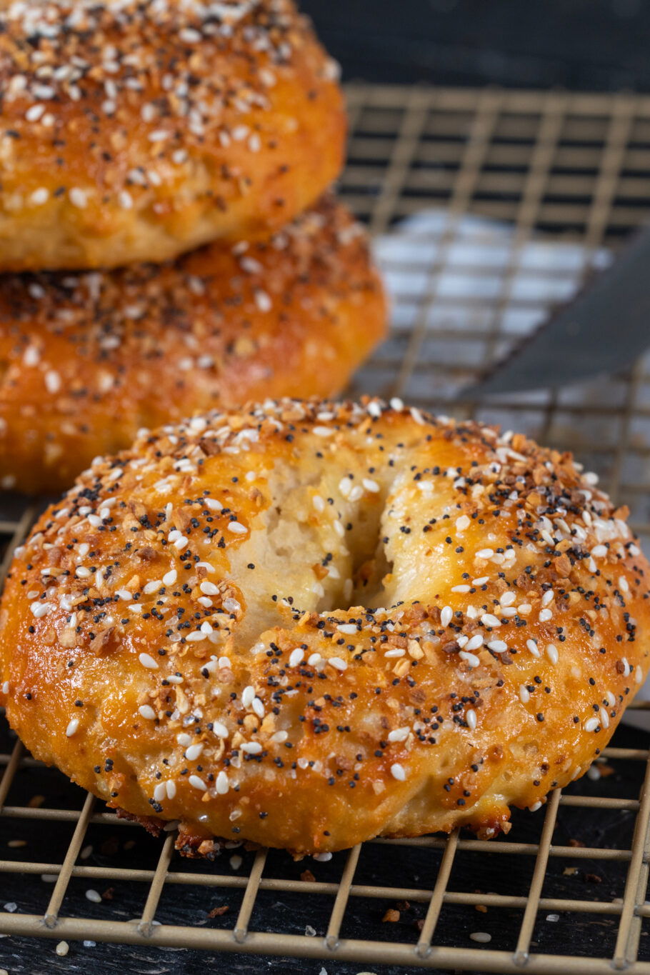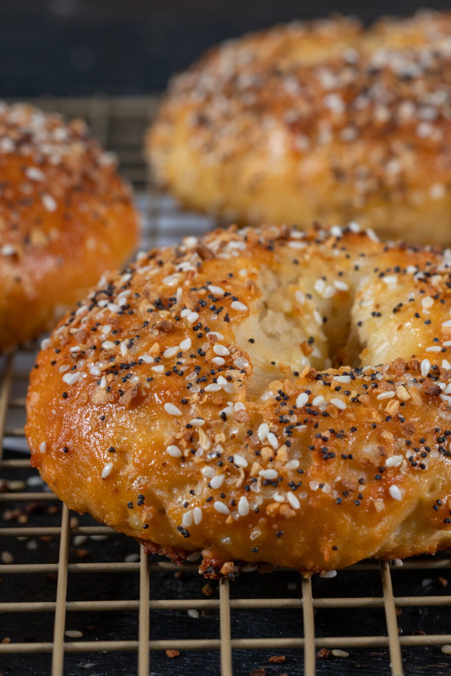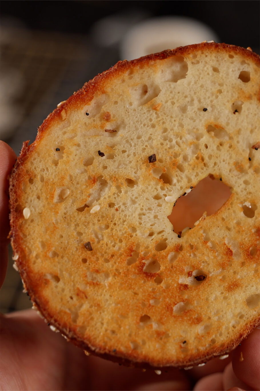 Last, beat an egg up and brush all your protein bagels with it. Choose your favorite bagel seasonings and sprinkle them on. My personal favorite? Everything seasoning which I’ll drop a link to below!