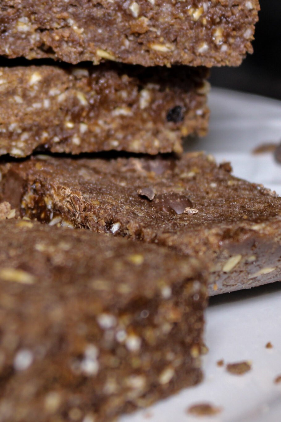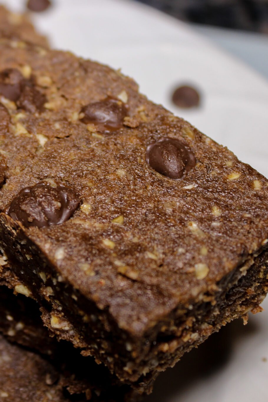 Top your bars with 2 tablespoons of chocolate chips and press them in. You could also use some crushed up nuts, dried fruit, sprinkles, etc.