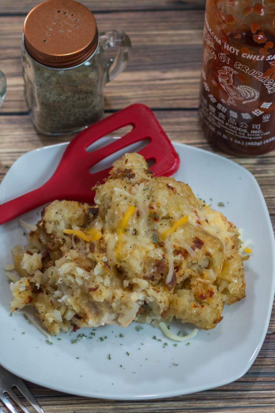 - Add in the rest of your Tater Tots followed by the rest of your Cheese, Bacon Bits, and Hot Sauce