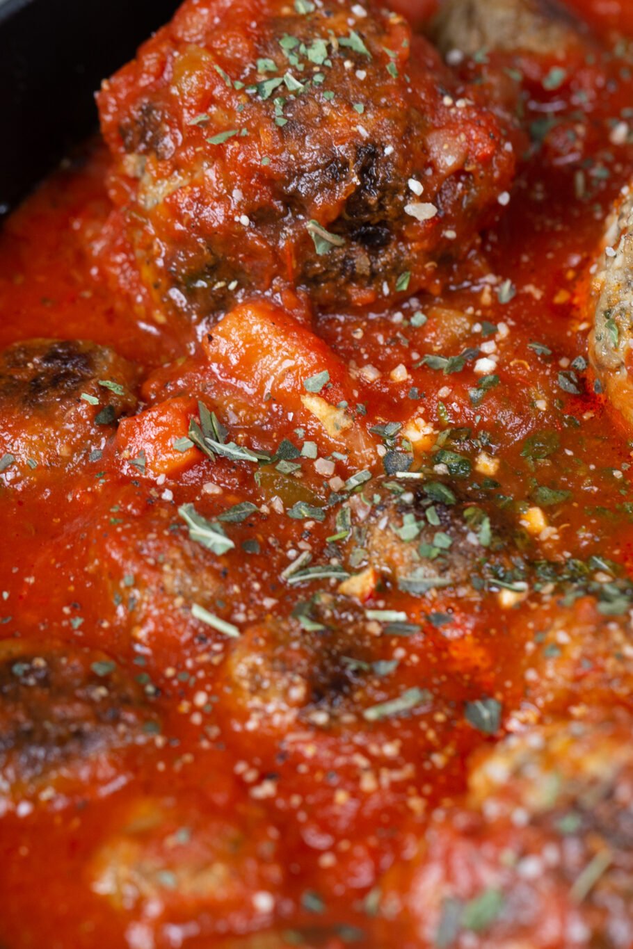 Once browned, turn your burner on low heat and add in a jar of your favorite pasta sauce. Put your cover on and let them cook for around 30 minutes or until they reach 165F/73C.