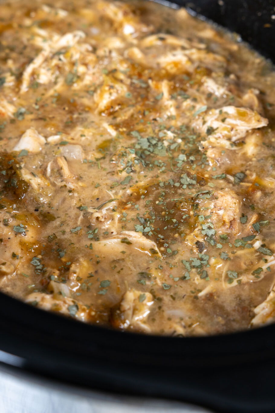 Finish with 1 teaspoon of dried or 1 tablespoon of chopped up fresh cilantro which will help add some additional flavor (and brightness!) to the chicken salsa verde recipe.