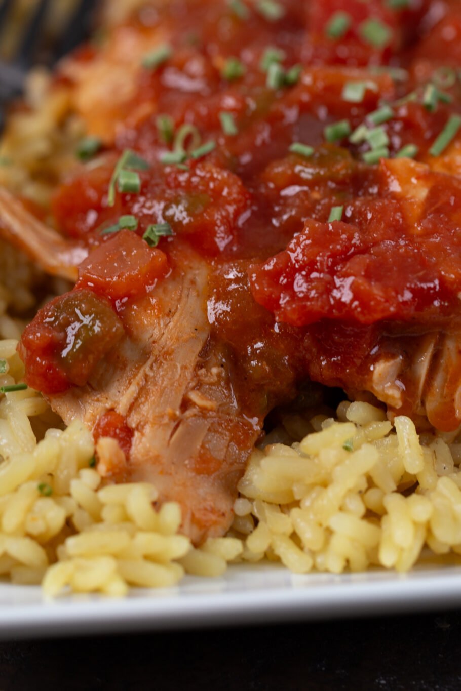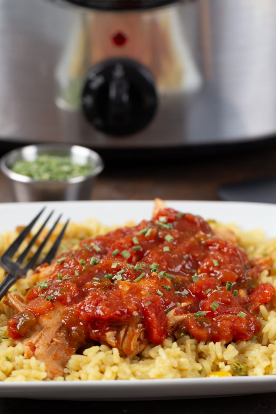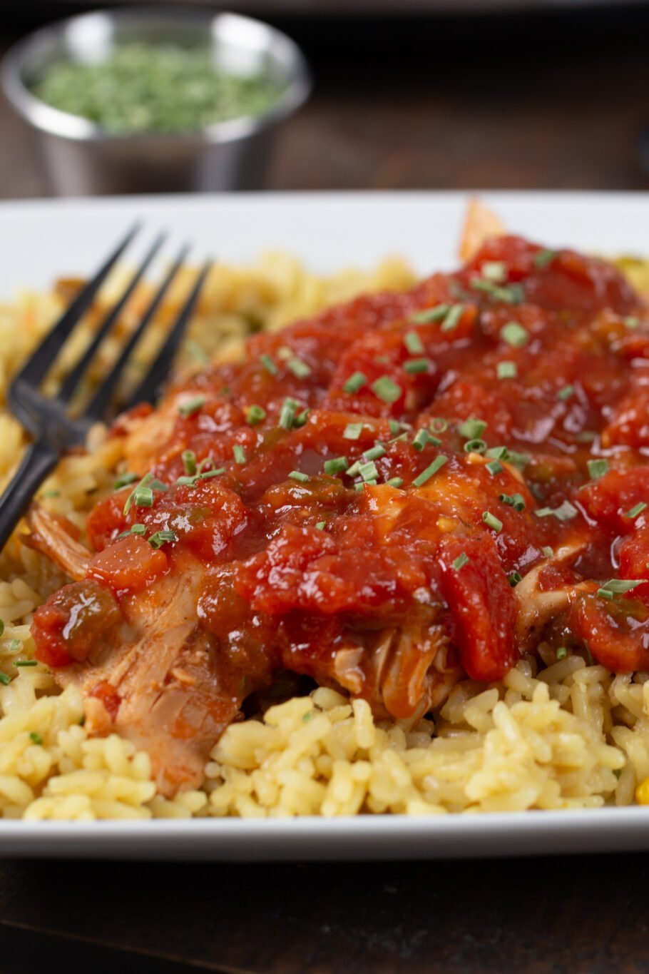 - You can shred the chicken 15-20 minutes before it’s done by using 2 forks and pulling apart like this