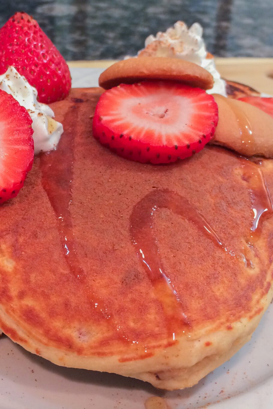 Remove your pancakes from the heat and optionally top them! I topped mine with some reduced fat wafers, whipped cream, and fresh strawberry slices.