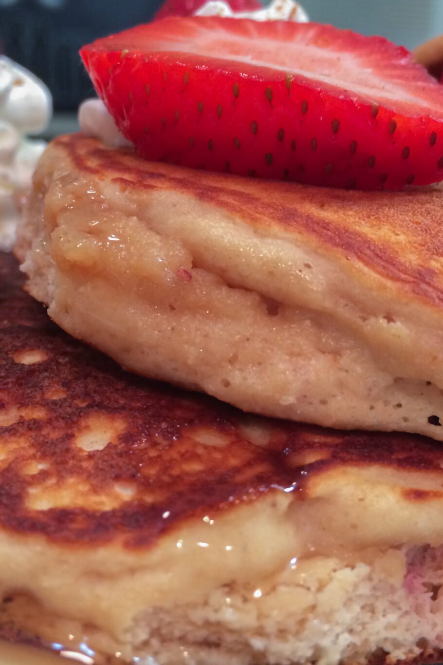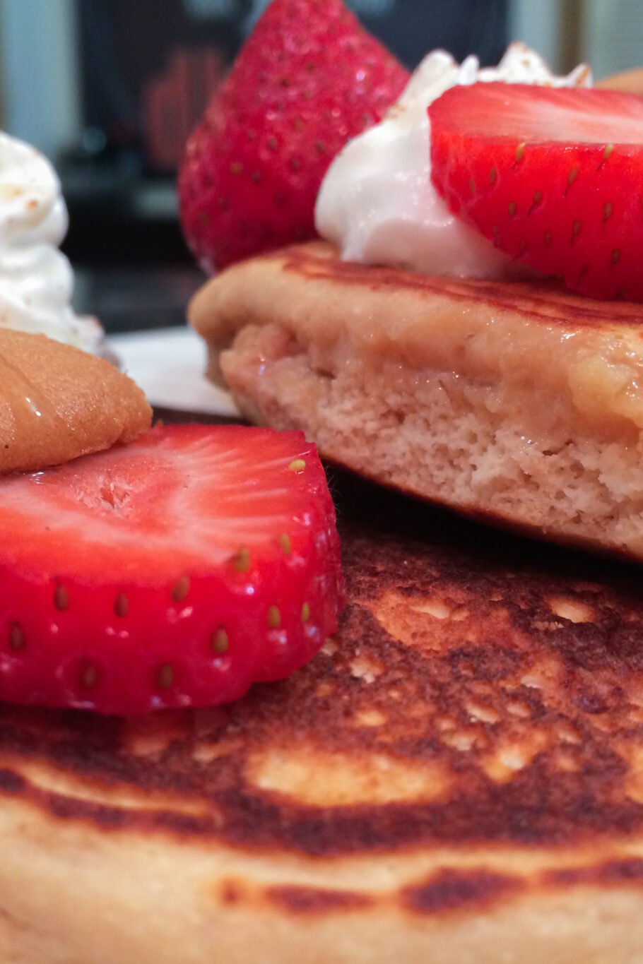 Strawberry shortcake for breakfast is here with these Strawberry Shortcake Protein Pancakes! This healthy pancake recipe is packed with shortcake flavor, easy to make, and a great alternative to the “real” thing!